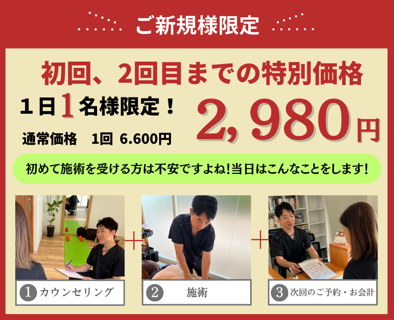 チラシやホームページからのご新規様のご来院の方は2回目までは特別価格でご対応させて頂きます。