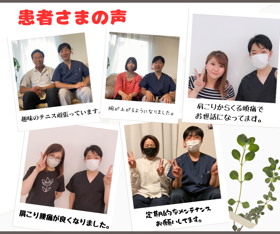 当院は、地域のご縁のある皆様の健康応援サポターとして、「人生100年時代」を笑顔で過ごせるようにお手伝いをさせて頂きたいという想いで日々施術させて頂いております。お身体の痛みや不調で悩み、あちこちの病院や治療院をめぐり、迷っている患者様も多いかと思います。