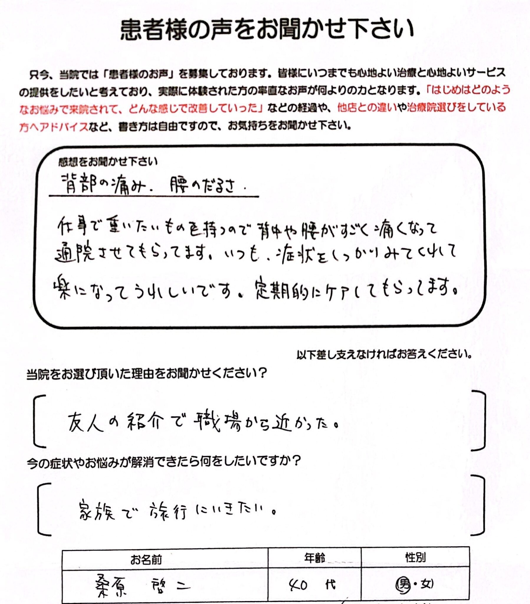 仕事で重たいものを持つので背部や腰がすごく痛くなって通院させてもらっています。症状をしっかりみてくれて楽になってうれしいです。定期的にケアしてもらってます。
