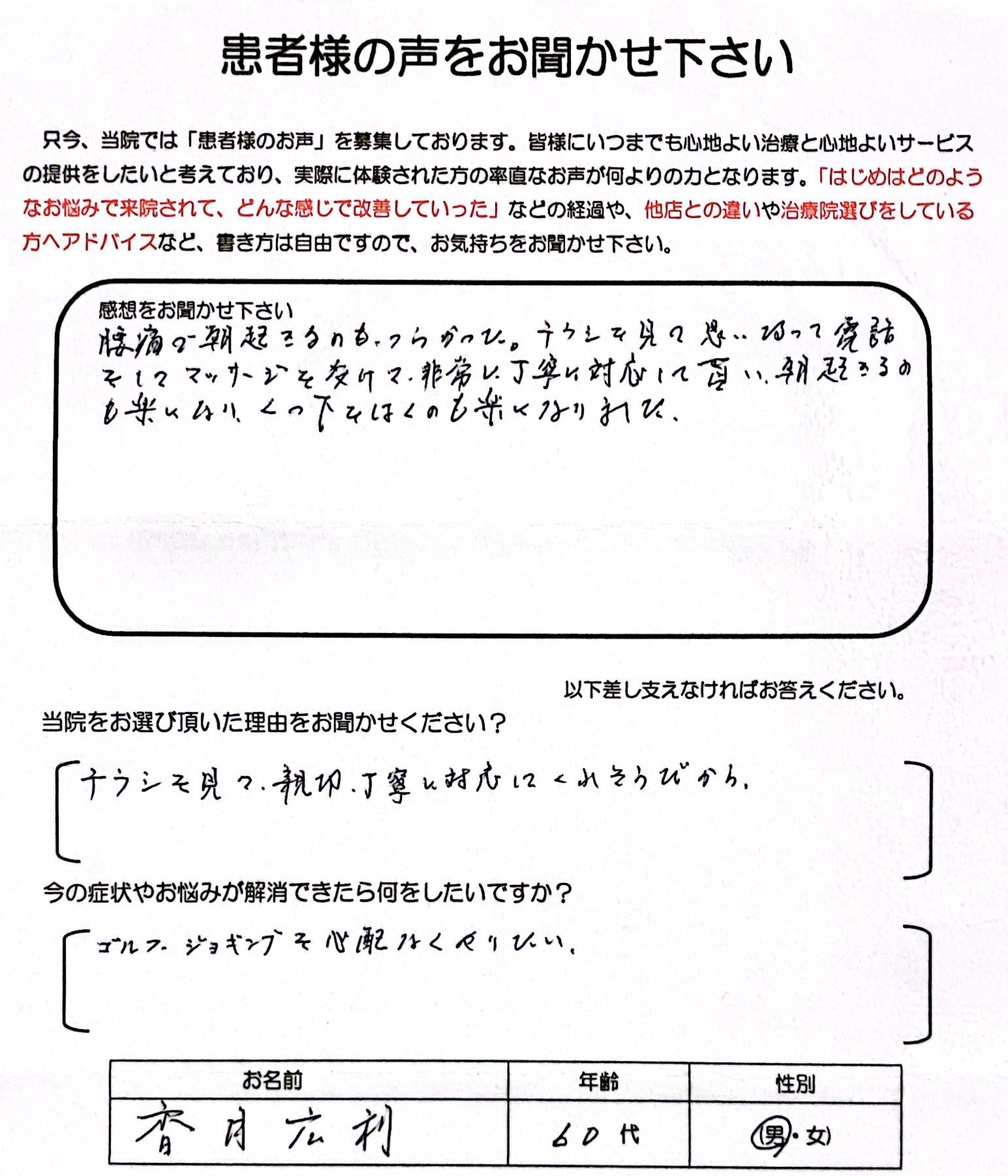 腰痛で朝起きるのもつらかった。チラシを見て思い切って電話をしてマッサージを受けて非常に丁寧に対応して貰い朝起きるのも楽になりくつ下をはくのも楽になりました。