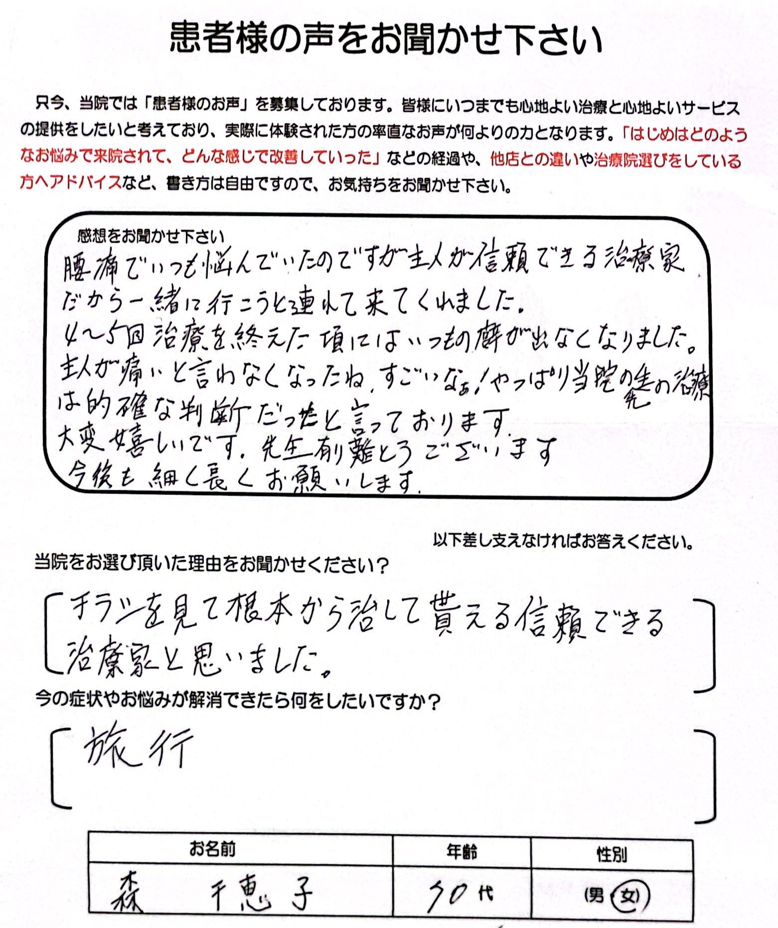 腰痛でいつも悩んでいたのですが主人が信頼できる治療家