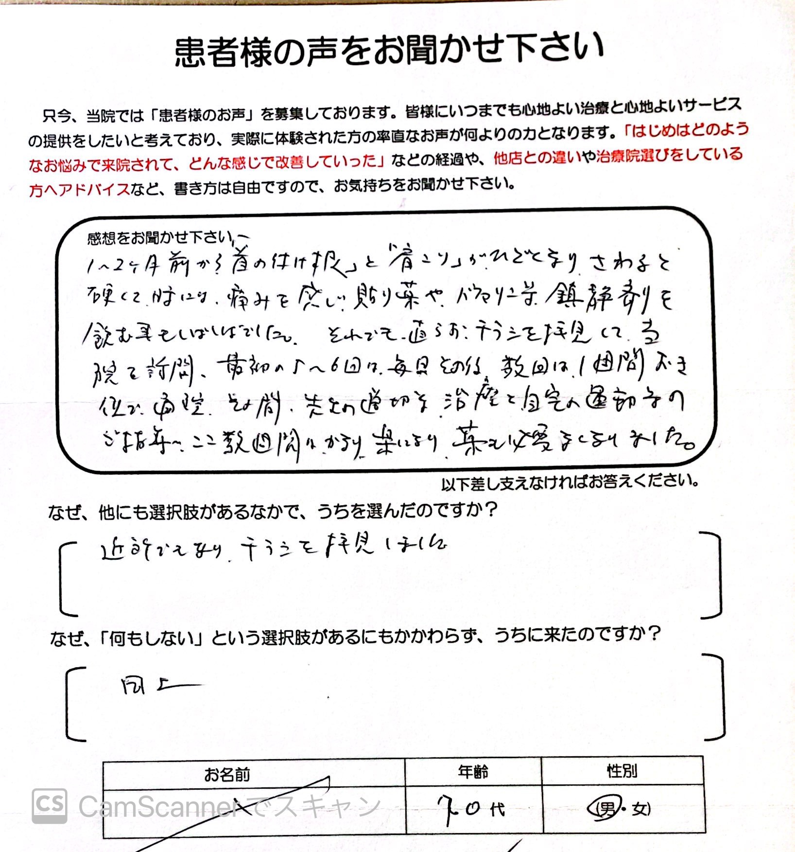 1~2ヶ月前から首の付け根と肩こりがひどくなりさわると硬くて時には痛みを感じ貼り薬や